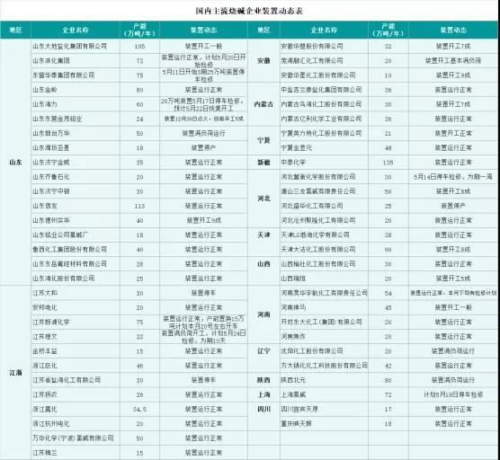 1、5月份山東、江蘇、河北、河南等地區(qū)均有氯堿企業(yè)有檢修計劃,裝置開工下降,市場貨源供應(yīng)也將減少。